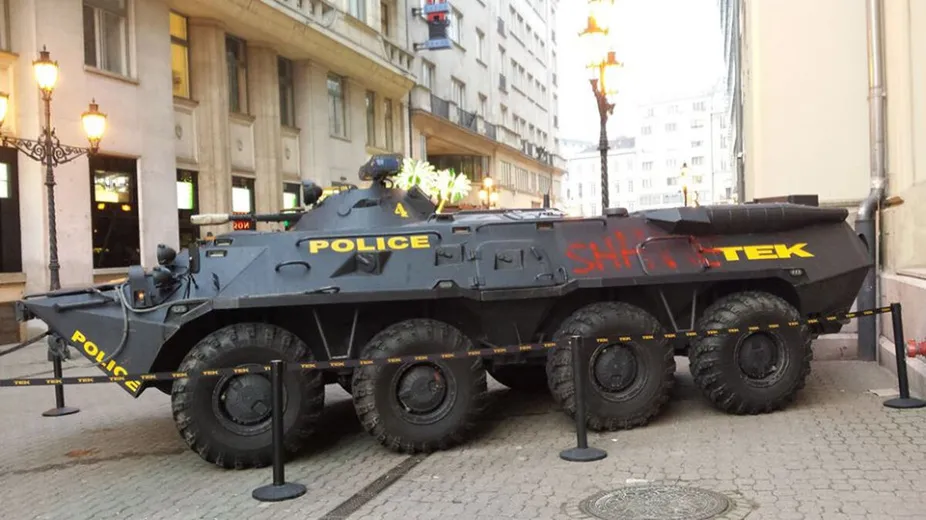 A TEK járművére vörös festékkel a shame, azaz szégyen feliratot firkálták ismeretlenek.