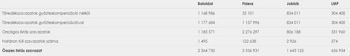 A listás szavazatok utáni mandátumeloszlást megfigyelve látható az, amiről korábban Tóth Zoltán beszélt a Hír TV online-nak, a választási szakértő akkor ugyanis kiemelte: a mostani rendszer túlzott kompenzációt ad a győztes pártnak az egyéni szavazatok után. Az általunk levezényelt „képzeletbeli választáson” például a Fidesz több mint 1,1 millió szavazatot kapna a győzteskompenzáció után, míg az általunk összeboronált „baloldal” alig több mint tízezret.