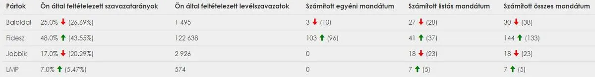 Ha most lennének a választások, és a biztos pártválasztókon múlna a dolog, akkor a Fidesz a kalkulátor szerint 103 egyéni mandátumot nyerne, ami héttel több, mint 2014-ben volt, illetve a kormánypárt szerezne 41 listás helyet, néggyel többet, mint a legutóbbi választáson. Így bőven meglenne a kétharmad, hiszen 144 fideszes képviselő ülne a parlamentben, a kétharmados többséghez pedig 133 kell (ennyit szereztek 2014-ben is).