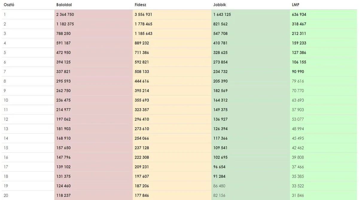 A listás mandátumok arányos kiosztására az úgynevezett D’Hondt-osztósort használják. Ez leegyszerűsítve annyit tesz, hogy mivel 93 listás mandátum van, ennyi sorba írják fel a pártokra leadott listás szavazatokat. Az első sorban még az összes szavazat szerepel, majd minden újabb sorban eggyel nagyobb számmal osztják el a szavazatszámot. Az így kapott osztósorban a 93 legnagyobb kapott szám egy-egy mandátumot jelent az adott pártoknak – mindegyik annyit kap, ahány szám van a saját oszlopában a 93 legnagyobb közül (a programban vastagítottal vannak jelölve, képünkön az első 20 sor látható és az, hogy az LMP már a hatodikban kiesett a matekból).
