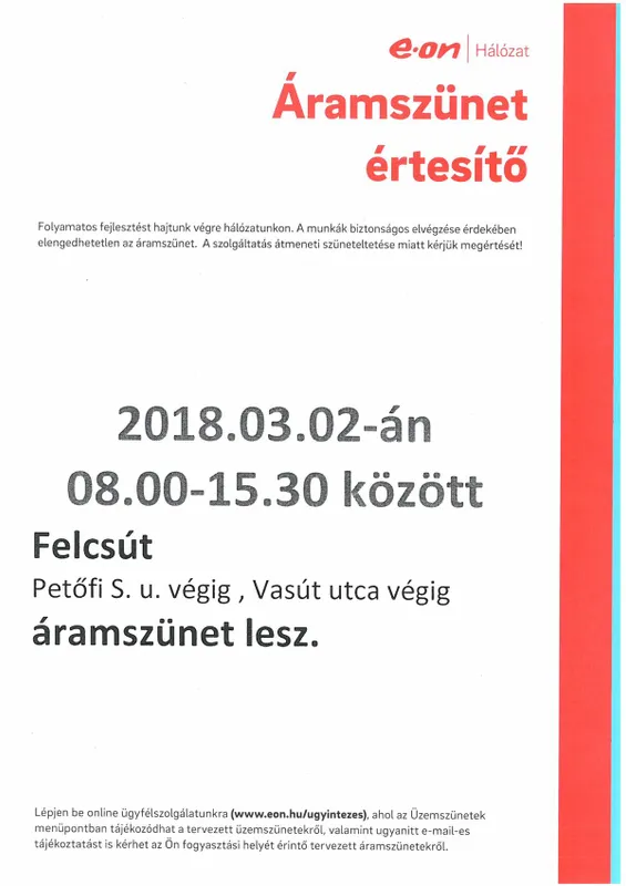 Az E.ON közben fejlesztési munkák miatti áramszünetet hirdetett március 2-ára Felcsúton.