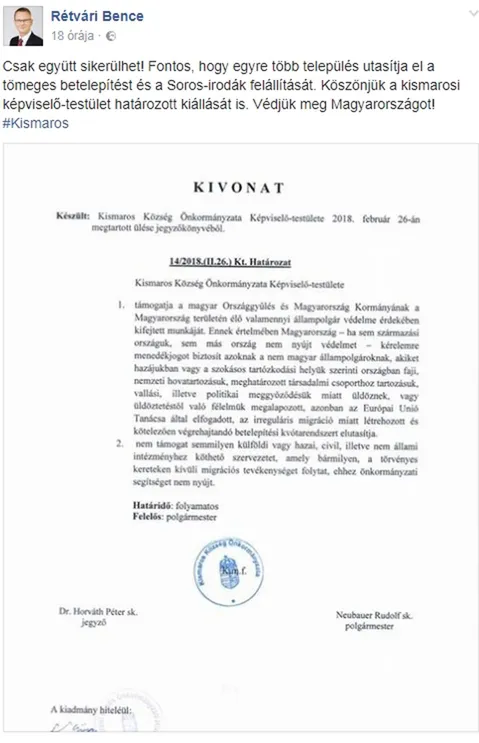 Kitűnik a többiek közül Rétvári Bence, a Fidesz–KDNP országgyűlési képviselőjelöltje, aki ezen sorok publikálása előtt nem egészen egy nappal, tehát február 27-én töltött fel a Facebook-oldalára egy kivonatról szóló fényképet, a témája pedig Soros György és az általa támogatott civil szervezetek. Rétvári azt írta: „Csak együtt sikerülhet! Fontos, hogy egyre több település utasítja el a tömeges betelepítést és a Soros-irodák felállítását. Köszönjük a kismarosi képviselő-testület határozott kiállását is. Védjük meg Magyarországot!”. Február 26-án már volt ebben a témában megírt két darab bejegyzés Rétvári oldalán, egy határozatkivonatról szóló fotóval a középpontban (ez egyébként nem egyezik azzal a képpel, amit 27-én töltött fel), valamint egy felhívás a saját arcképével arra a verőcei rendezvényre, amelyet február 28-án, szerdán tartanak a témában a helyi művházban. Rétvárihoz vagy nem jutott el az üzenet, hogy kevesebb Soros, vagy annyira meg kell védeni hazánkat a migránsoktól, hogy azért cserébe még a párttal is szembe lehet menni, és még egy fórum is belefér.