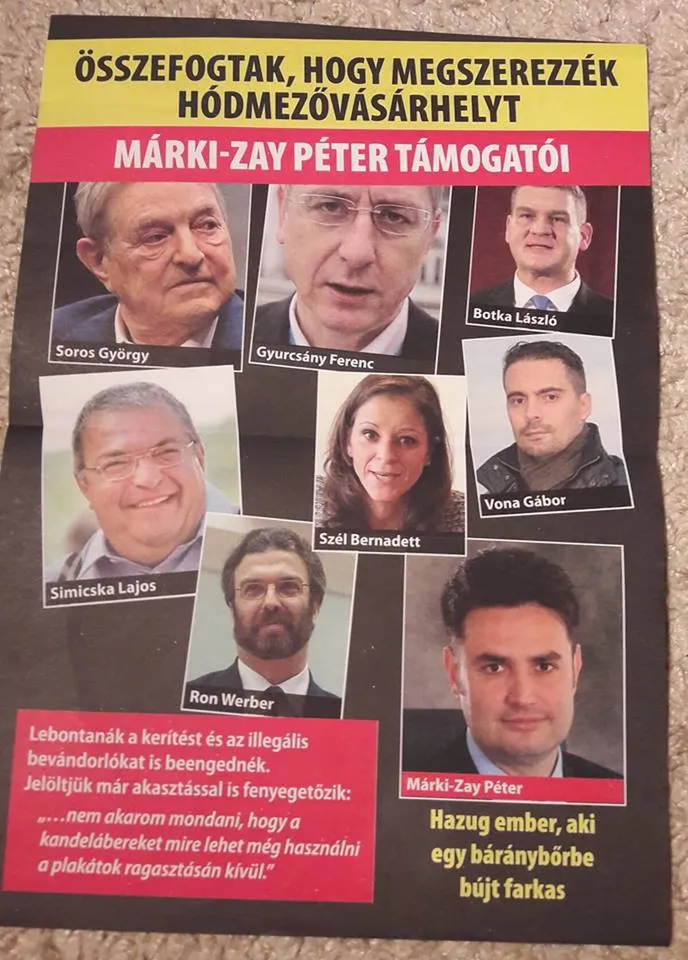 Szórólapon listázzák a hódmezővásárhelyi független polgármesterjelölt támogatóit, amelyen a magánszemélyek mellett a zsidó hitközséget is feltüntetik. Márki-Zay Péter riválisai telefonon is zaklatják a helyieket: egy hódmezővásárhelyi jobbikos képviselő nevében szólítanak fel a fideszes Hegedűs Zoltán támogatására.