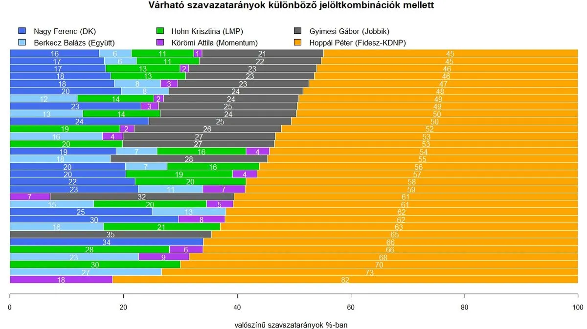 A kutatók indirekt becslései alapján (ekkor megpróbálják azoknak a pártpreferenciáit is besorolni, akik nem adtak választ a vonatkozó kérdésekre) azonban az LMP-s jelölt egymaga 46 százalékot kapna, mögötte nem sokkal lemaradna Nagy, Gyimesi és Berkecz következne, előbbire 44,, utóbbi kettőre pedig 42 százalék voksolna. A Momentum jelöltje 64-36 arányban maradna alul Hoppál Péterrel szemben.