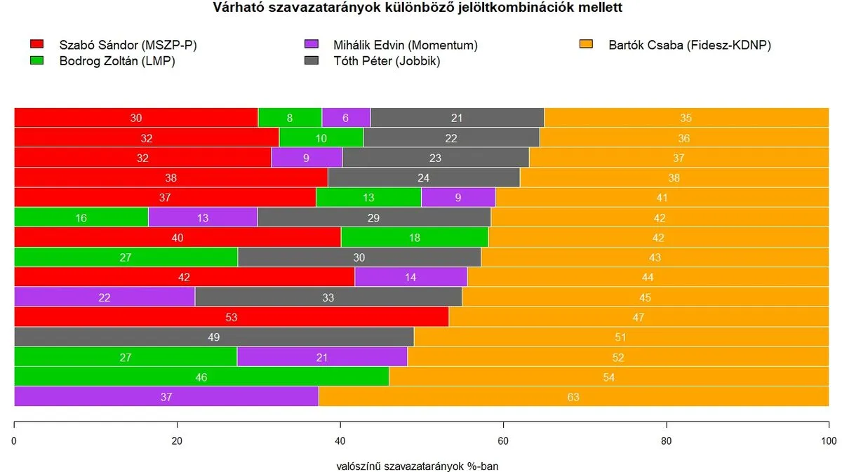 Szabó és Tóth közül előbbi az esélyesebb jelölt, mivel a kutatási eredmények szerint a szocialista jelölt már akkor is jó eséllyel behúzná az egyébként „klasszikusan balos körzetnek” számító szegedi körzetet, ha csak az LMP és a Momentum lépteti vissza jelöltjét a javára. Ekkor Szabó és Bartók is 38 százalékot szerezne, míg a Jobbik jelöltje 24-gyel végezne. Ez a forgatókönyv egyébként reális, hiszen az LMP a napokban egyeztet az MSZP–P-vel a visszaléptetésekről, és a Momentum sem zárkózott el a koordinációtól, míg a Jobbikban egyelőre nincs ilyen szándék.