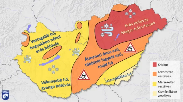 Az Országos Meteorológiai Szolgálat egy térképet is közzétett internetes oldalán, ahol jelzi, hogy az ország mely részében várható kritikus időjárás közlekedési szempontból.