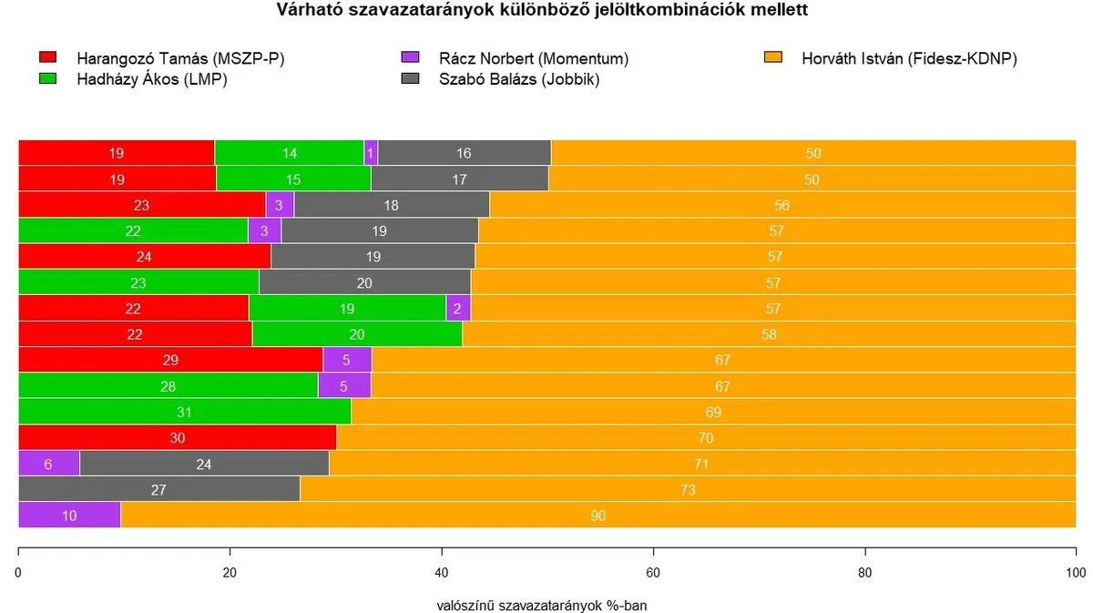 Így az LMP-s jelölt 37 százalékot szerezne, Harangozó Tamás és Szabó Balázs 31-31 százalékot kapna, ha egyedül indulnának a Fidesszel szemben. A momentumos Rácz Norbertre 23 százalék szavazna, ha nem egyedül szállna szembe Horváth Istvánnal. Az indirekt becsléses számadatok között a Közös Ország Mozgalom honlapján böngészhet.