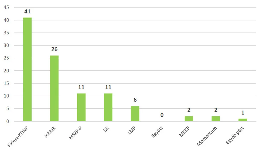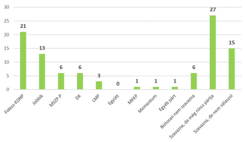 A pártot választani tudók 41 százaléka a Fidesz–KDNP-re, 26 százaléka a Jobbikra voksolna egy jövő vasárnapi országgyűlési választáson, míg az MSZP és a DK támogatottsága ebben a kategóriában 11-11 százalék, az LMP 6 százalékon áll. A Momentum és az MKKP a pártválasztók 2-2 százalékát tudhatja magáénak.