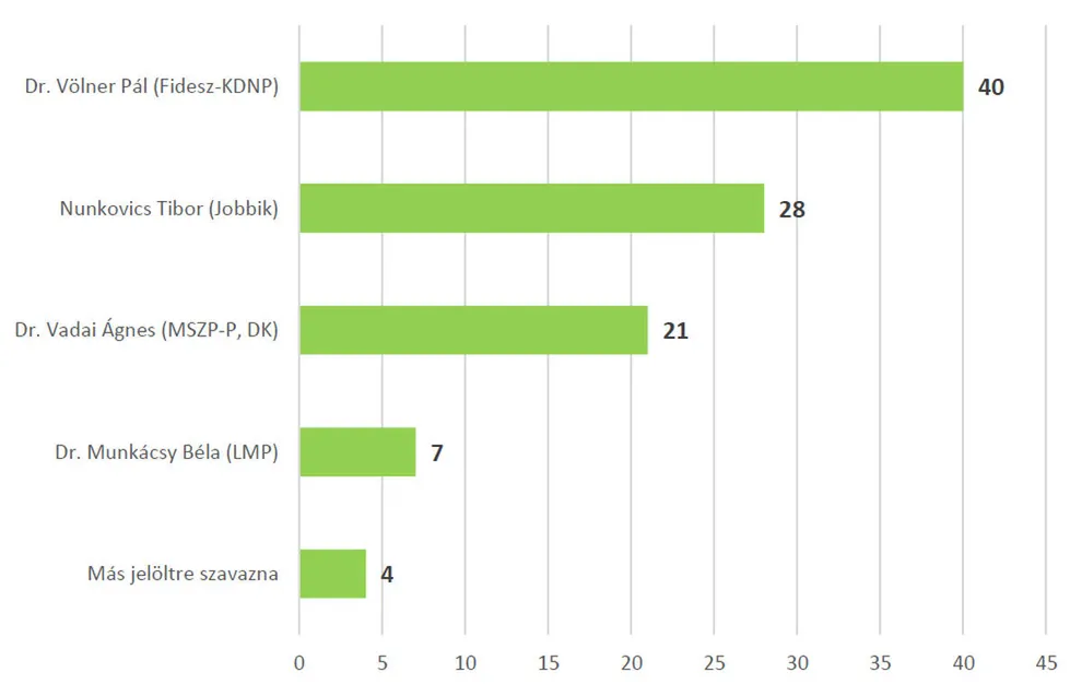 Az egyéni képviselőjelölti preferenciával rendelkező választók 40 százaléka voksolna a Fidesz–KDNP-re egy jövő vasárnapi országgyűlési választáson. Az ellenzéki jelöltek közül Nunkovics Tibort támogatják legnagyobb arányban, a Jobbik jelöltjére az egyéni képviselőjelölti preferenciával rendelkezők 28 százaléka voksolna. Vadai Ágnes támogatottsága 7 százalékponttal alacsonyabb, a DK politikusa 21 százalékon áll, míg az LMP jelöltje a szavazók 7 százalékát tudhatja maga mögött. Érdemes megjegyezni, hogy a választókerület teljes népessége körében rendkívül magas a szavazni vágyó, de szilárd párt-, illetve jelöltpreferenciával nem rendelkező választók aránya; e csoport komoly meglepetéseket okozhat április 8-án.