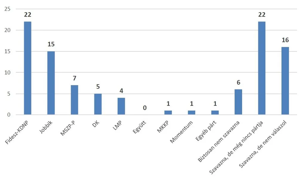 A pártot választani tudók 39 százaléka a Fidesz–KDNP-re, 26 százaléka a Jobbikra voksolna egy jövő vasárnapi országgyűlési választáson, míg az MSZP–Párbeszéd támogatottsága ebben a kategóriában 13, a DK-é 10 százalékon áll. Az LMP-t 7 százalék támogatja. A Momentum 2, az MKKP és az Együtt 1–1 százalékon áll.