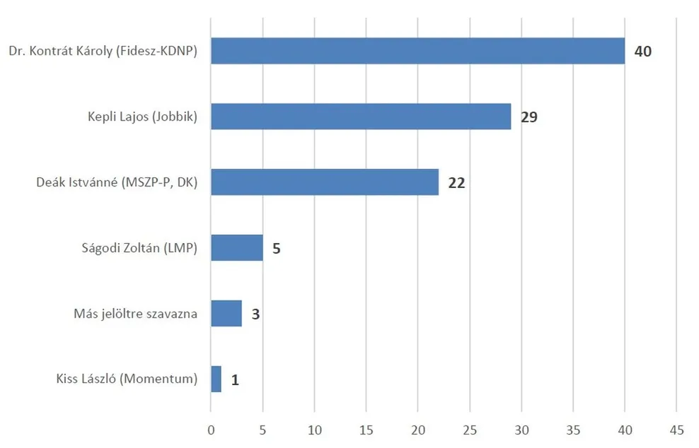 Az egyéni képviselőjelölti preferenciával rendelkező választók 40 százaléka voksolna dr. Kontrát Károlyra (Fidesz–KDNP). A legesélyesebb ellenzéki jelölt egyértelműen Kepli Lajos a Jobbik színiben. Az MSZP–Párbeszéd és a DK közös jelöltjére, Deák Istvánnéra a pártválasztók 22 százaléka szavazna. Az LMP jelöltje, Ságodi Zoltán István 5, Kiss László a Momentum színeiben 1 százalékon áll.