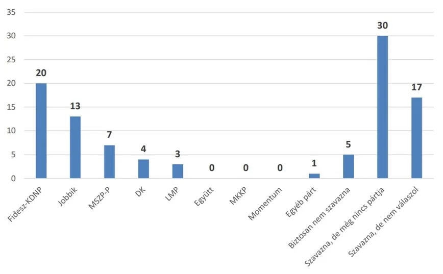 A pártot választani tudók 41 százaléka a Fidesz–KDNP-re, 27 százaléka a Jobbikra voksolna egy jövő vasárnapi országgyűlési választáson, míg az MSZP–P támogatottsága ebben a kategóriában 14, a DK-é 8 százalékon áll. Az LMP-t 7 százalék támogatja. A Momentum és a Magyar Kétfarkú Kutya Párt (MKKP) 1-1 százalékon áll.
