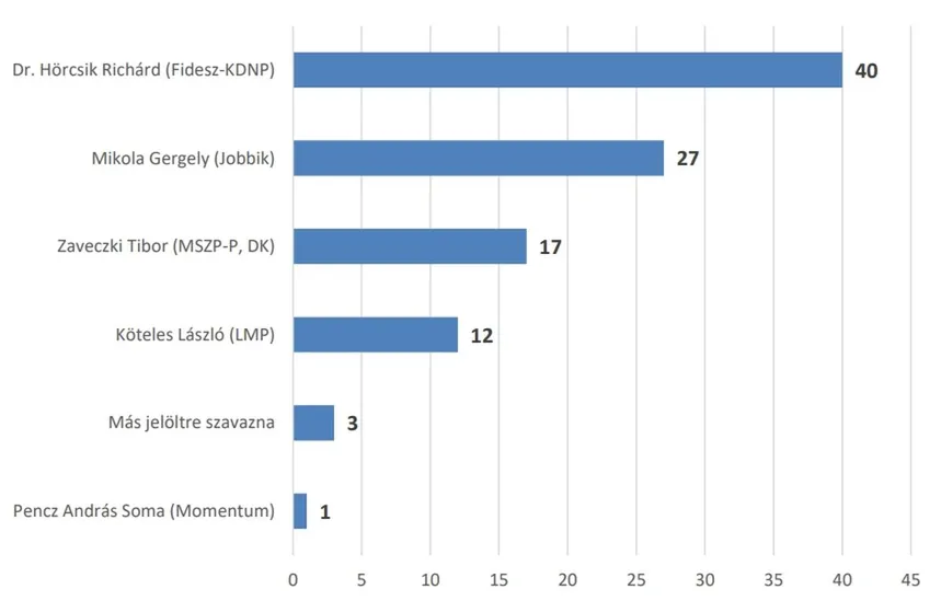 Azoknak a választóknak, akiknek van egyéni képviselőjelölti preferenciájuk, 40 százaléka Hörcsik Richárdra (Fidesz–KDNP), 27 százaléka a Jobbik jelöltjére, Mikola Gergelyre voksolna. Az MSZP–Párbeszéd és a Demokratikus Koalíció (DK) közös jelöltjére, Zaveczki Tiborra 17 százalék szavazna, de az LMP jelöltjének, Köteles Lászlónak (Komlóska polgármesterének) is magas, 12 százalékos támogatottsága van. A teljes népességen belül igen magas azoknak a szavazóknak az aránya, akik választási részvételi hajlandóságot mutatnak, de nincs jelölt- és pártpreferenciájuk; ez a taktikai szavazás mellett döntő befolyással bírhat az egyéni preferenciák alakulására.
