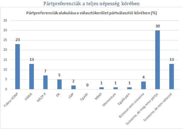 A választókerületben a Fidesz–KDNP a teljes népesség 23%-ának támogatását tudhatja maga mögött, míg a Jobbik 13%-on áll. Az MSZP–P-t a teljes népesség 7%-a támogatja, míg a DK 5%-on áll. Az LMP-re csupán a teljes népesség 2, az MKKP-ra és a Momentumra 1-1%-a voksolna.