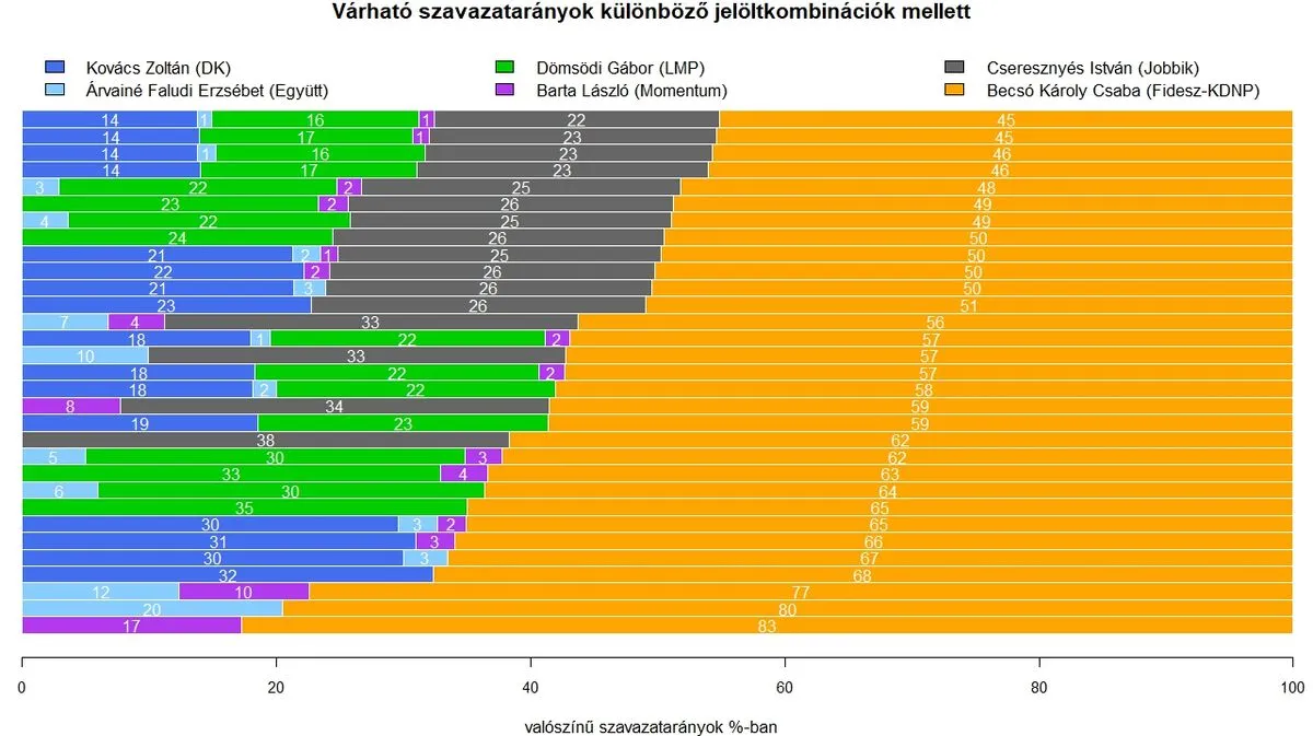 Ha minden ellenzéki elindul a körzetben, akkor a Fidesz 45 százalékkal húzná be a körzetet, Becsó mögött a Jobbik jelöltje 22, Dömsödi 26, Kovács pedig 16 százalékot kapna. Az Együtt és a Momentum jelöltje 1–1 százalékon áll.