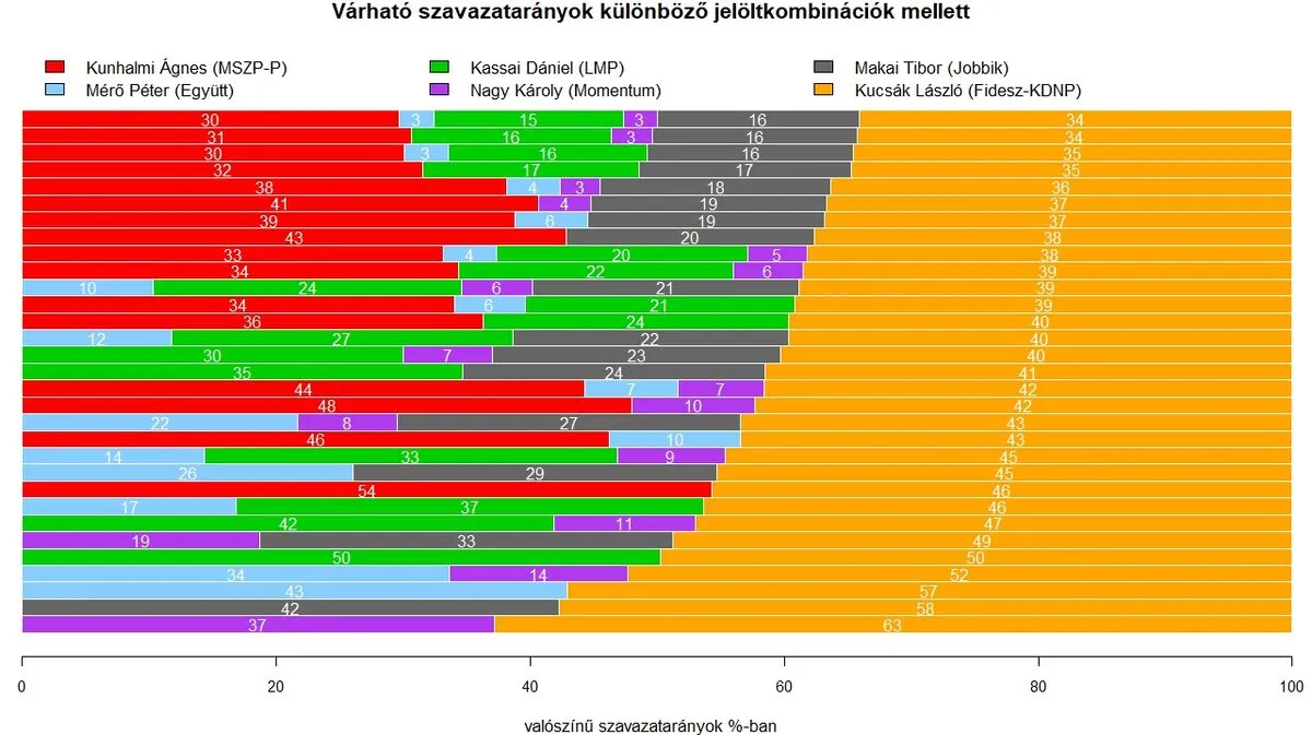 Az alábbi ábrán is látható, hogy egyedül Kunhalminak van esélye megnyerni a körzetet az esetleges visszalépések után. Makai minden esetben alulmaradna, az LMP jelöltje pedig csak megszorongatni tudná Kucsák Lászlót, megverni valószínűleg nem, de hasonlóan 2014-hez, pár tucat szavazaton múlna a siker. Emlékezetes, négy éve Kunhalmi mindösszesen 56 szavazattal kapott kevesebbet, mint a Fidesz jelöltje.
