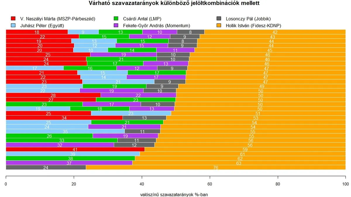 A kutatók indirekt becslései is hasonló képet mutatnak – ezekben azt szimulálták, mi lenne, ha a választókból eltűnne a bizonytalanság, mindenki tudná, kire szavazna, ha az általa preferált jelölt visszalépne. Ekkor Fekete-Győr és Csárdi 51 százalékkal húzná be a körzetet, V. Naszályi pedig fej fej mellett végezne Hollikkal szemben. Juhász Péter 51-49 arányban maradna alul, tehát ő is esélyes lehet, Losonczy pedig így a voksok 40 százalékát kapná.