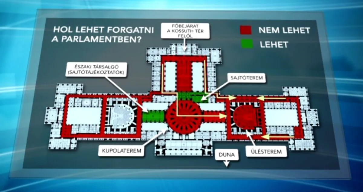 Mint a Hír TV által készített grafikán is jól látszik: a pirossal jelölt zónákban tilos forgatni, a zölddel jelölt két részen pedig szabad. Mivel a kormánypárti politikusok többsége szinte soha nem vállal interjút kritikus sajtóval, az újságírók jobb híján a zöld területen várakozva tudnak feltenni kérdéseket egy-egy arra járó politikusnak.
