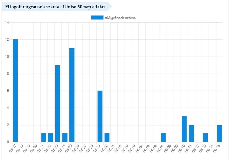 A portál grafikonját kiolvasva az is látszik, hogy az előző hónapban, tehát májusban ez a szám 77-re volt tehető. Összehasonlításul tavaly májusban 112 személyt fogtak el a hatóságok, míg 2015-ben, amikor rengeteg menekült indult útnak, a májusi szám 11979 volt.