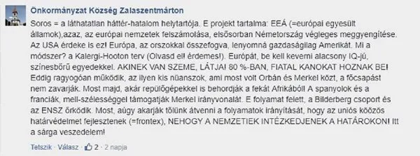 „Soros = a láthatatlan háttér-hatalom helytartója" - kezdődik a Facebook-komment, amit nem Zalaszentmárton község önkormányzata jegyez a kormánypárti Magyar Hírlap egyik migránsokkal foglalkozó cikkénél. A kommentből kiderül, a háttérhatalmi projekt lényege, hogy „Európát be kell keverni alacsony IQ-jú színesbőrű egyedekkel. AKINEK VAN SZEME LÁTJA! 80 %-BAN FIATAL KANOKAT HOZNAK BE!"
