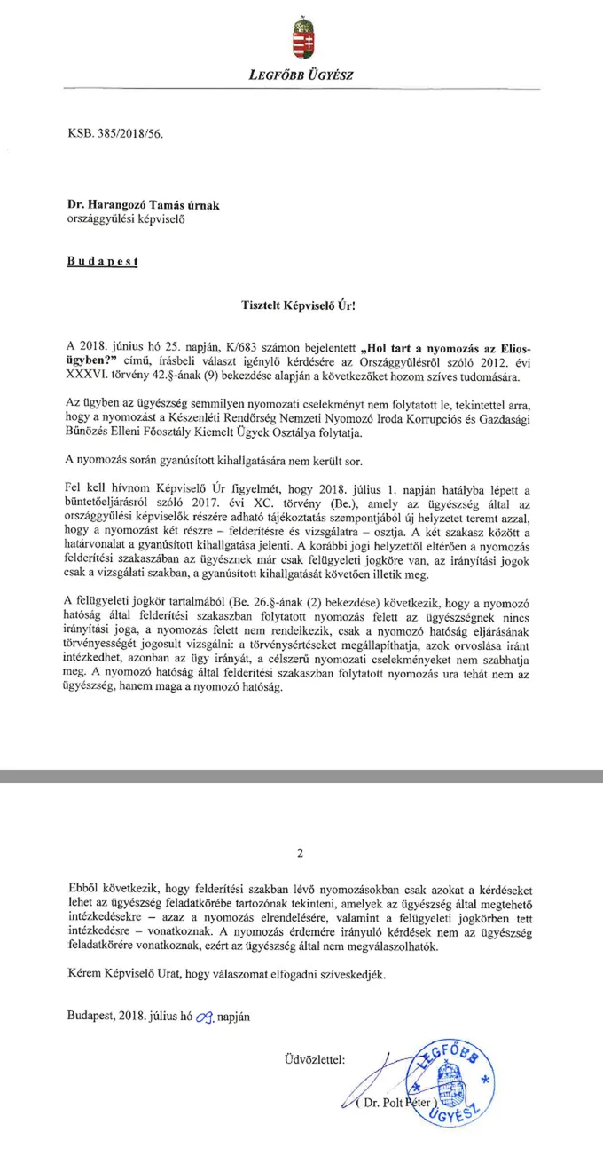 Ugyanezt a választ (levél alább) kapta Harangozó Tamás szocialista képviselő, amikor arról érdeklődött, hogy az ügyészség milyen nyomozati cselekményeket folytatott az Elios-ügyben.
