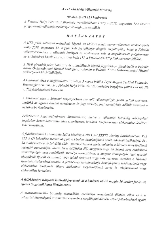 A Fidesz–KDNP jelöltjét, Mészáros László Istvánt választották polgármesterré a Fejér megyei Felcsúton vasárnap tartott időközi polgármester-választáson.