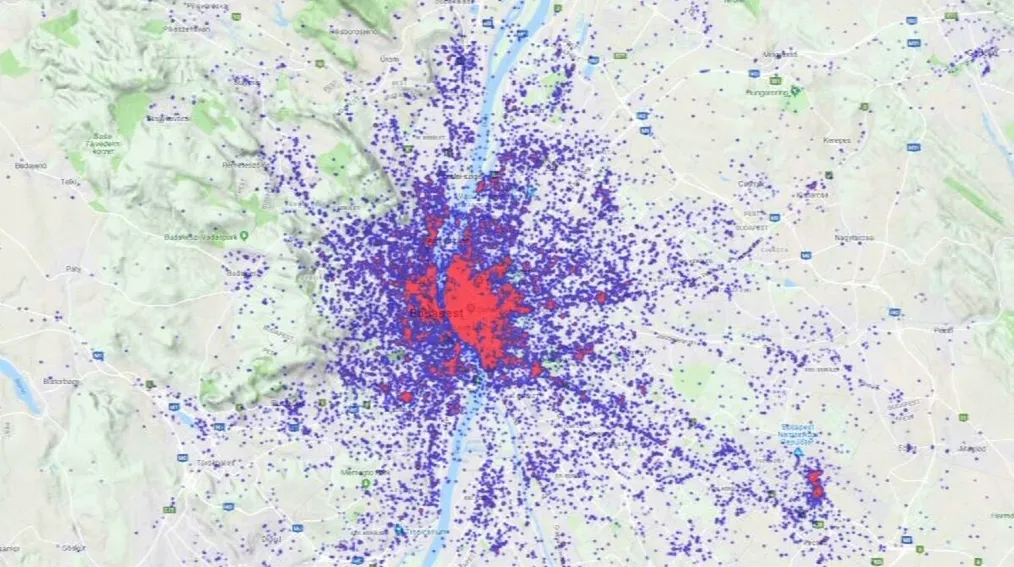A térkép Budapest és az agglomeráció legfrekventáltabb pontjait mutatja 2017 szilveszterének éjjelén és 2018. január 1-jén.