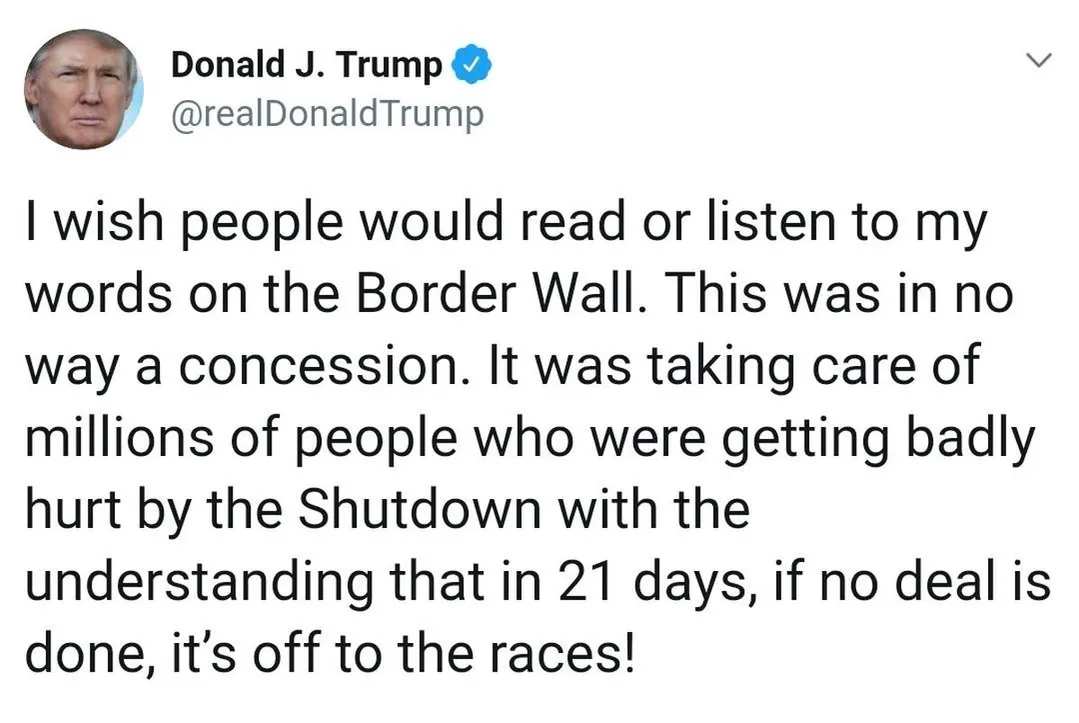Az amerikai történelem leghosszabb leállása miatt csökkent az elnök népszerűsége, az egyre nagyobb nyomás hatására Trump pénteken ideiglenesen megállapodott a törvényhozókkal, hogy február 15-ig újraindulhatnak az intézmények. Hozzátette ugyanakkor, amennyiben a határkérdésben nem sikerül megegyezniük, ismét befagyaszthatja a finanszírozást, vagy rendkívüli állapot kihirdetve a hadsereg büdzséjéből fedezheti a fal építését.