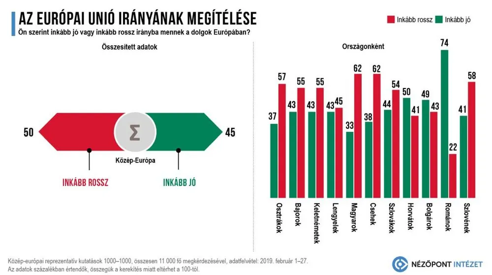 Annak ellenére, hogy nem szeretnének kilépni, Közép-Európában inkább úgy gondolják a emberek, hogy rossz irányba mennek a dolgok a kontinensen (50 százalék), és kevesebben vannak azok, akik szerint jó irányba tartanak a folyamatok (45 százalék). A legkritikusabb álláspontot a magyarok fogalmazták meg: 10-ből 6 válaszadó szerint rossz irányba tart az unió, de hasonló mértékben voltak elégedetlenek az osztrákok (57 százalék), és a szlovének (58 százalék) is. A legjobb véleményt Romániában lehetett mérni, 74 százalék szerint jó irányba mennek a dolgok. Beszédes, hogy csak a románoknál volt túlnyomó többségben az optimista álláspont, az elégedettebbek közé rajtuk kívül csupán a horvátok (50 százalék) és a bolgárok (49 százalék) tartoztak, ők is csak halvány relatív többséggel.