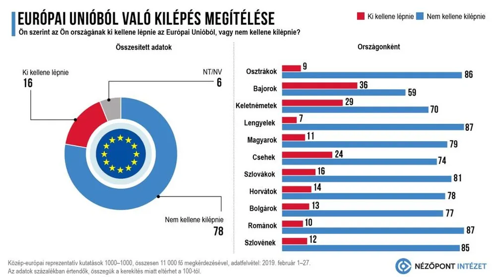 Közel négy héttel az Európai Parlament újraválasztása előtt látható, hogy minden közép-európai országban komoly többségben vannak azok, akik szerint a nehézségek megléte ellenére bent kéne maradni az Európai Unióban. Mindösszesen 17 millióan lépnének ki és 83 millióan maradnának bent az EU-ban Közép-Európa 107 millió fős lakosságából. A közép- európaiak 78 százaléka bentmaradna, és mindösszesen 16 százaléka hagyná el az EU-t. Meglepő módon a bajorok (36 százalék) és a keletnémetek (29 százalék) voltak leginkább a kilépés pártján, őket a csehek (24 százalék) követték. A magyarok továbbra is bentmaradáspártiak: 79 százalékuk szerint bent kellene maradni, és csupán 11 százalék mondta azt, hogy el kellene hagyni az uniót.