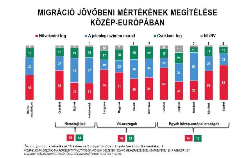 Számszerűsítve mindez azt jelenti, hogy a nagyságrendileg 112 millióból 88 millió közép-európai választópolgár szerint növekedni vagy legalábbis stagnálni fog az Európai Unióba irányuló migráció mértéke. Leginkább a bevándorlók által használt útvonalakon fekvő országok lakosai számítanak a növekedésre: Szerbiában 63, Horvátországban 59 százalék mondta azt, hogy emelkedni fog a bevándorolni vágyók száma, de még a lengyelek 55 százaléka is így vélekedett. Magyarországon 10-ből 5 választó számít növekedő migrációs helyzetre. A legkevesebben, de még mindig közel az emberek egyharmada van ezen az állásponton Kelet- Németországban (31 százalék), Bajorországban (32 százalék) Bulgáriában (33 százalék) és Romániában (35 százalék). Jelzésértékű, hogy még a legkevésbé pesszimista Csehországban is csak 25 százalék mondta azt, hogy csökkenni fog a migráció jövőbeni mértéke.