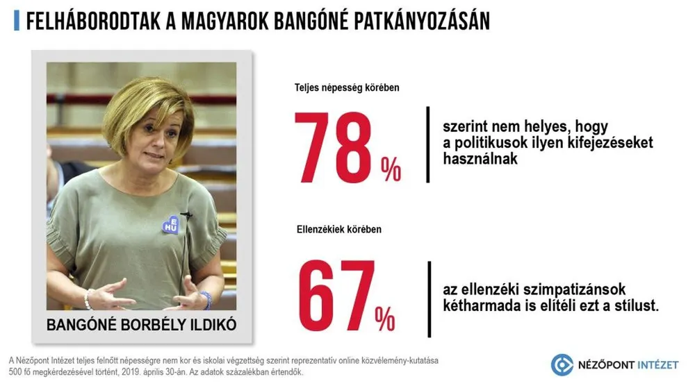 A Nézőpont Intézet online villámkutatást végzett, melyből kiderült, hogy a magyarok többsége (54 százalék) felháborítónak tartja Bangóné Borbély Ildikó, az MSZP parlamenti képviselőjének kijelentéseit, mely szerint azért nő a Fidesz-KDNP népszerűsége, mert sok a patkány Magyarországon.