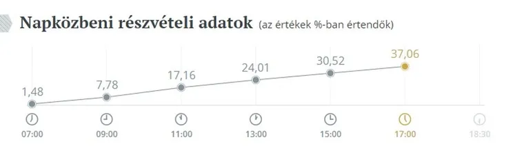 Az Európai Parlament (EP) magyar tagjainak választásán vasárnap 17 óráig a szavazásra jogosultak 37,06 százaléka adta le szavazatát a magyarországi szavazókörökben a Nemzeti Választási Iroda (NVI) adatai szerint. A több mint 10 ezer szavazókörben este hét óráig közel 7,9 millió ember adhatja le voksát.