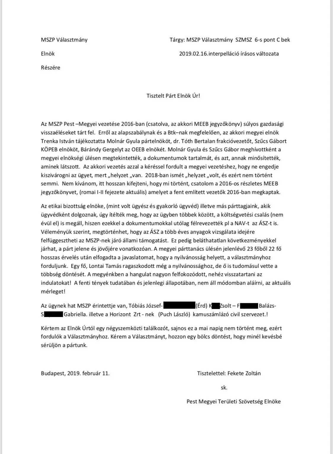 Fekete Zoltán Pest megyei pártvezető az MSZP elnökének címzett, a párt belső levelezésében is szétküldött februári levele azzal kezdődik, hogy a szocialisták Pest megyei szervezete 2016-ban súlyos, sokmilliós gazdasági visszaéléseket tárt fel, amiről több ismert MSZP-s politikust, többek között Molnár Gyula akkori pártelnököt, illetve Tóth Bertalan frakcióvezetőt is tájékoztatták.