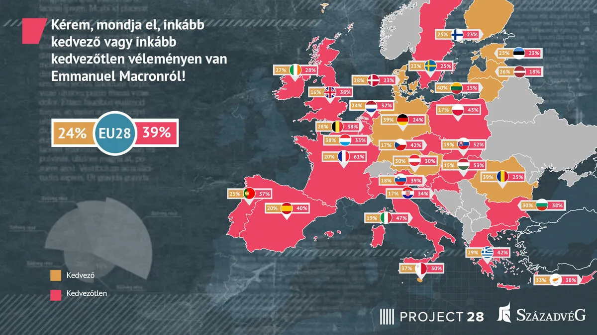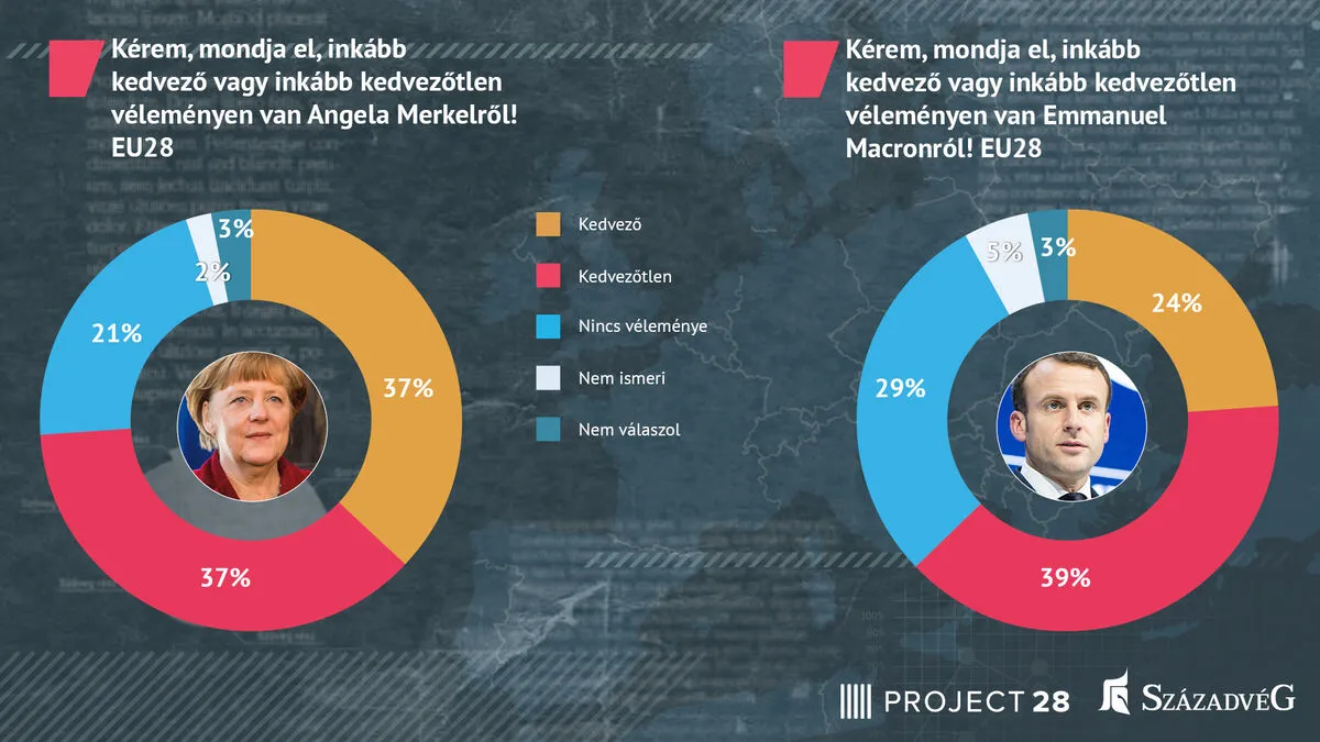 A Századvég Project28 kutatásában megvizsgálta Európa vezető politikusainak megítélését. Angela Merkel és Emmanuel Macron bár közelítették a német-francia együttműködést, szövetségük és elhibázott politikai manővereik – például a migrációs válság kezelésében – veszélybe sodorták az egész kontinenst, valamint megágyaztak a nemzetek felett álló, Európai Egyesült Államok koncepciójának. Bár önmagukat Európa legfőbb vezetőinek, és a világpolitika pozitív szereplőinek gondolják, az európai emberek már kevésbé vannak megelégedve teljesítményükkel - olvasható a Századvég Alapítvány közleményében.
