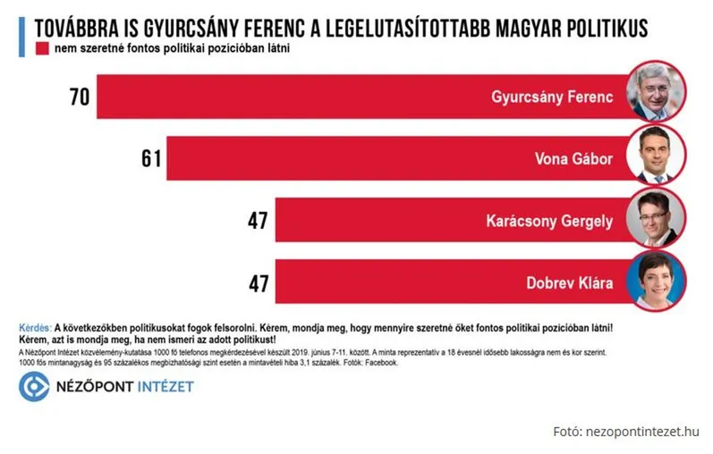 A távirati irodához pénteken eljuttatott felmérés szerint Gyurcsány Ferencet csupán a magyarok 14, Vona Gábort 17, Dobrev Klárát 19, Karácsony Gergelyt pedig 20 százaléka szeretné „fontos politikai pozícióban” látni.