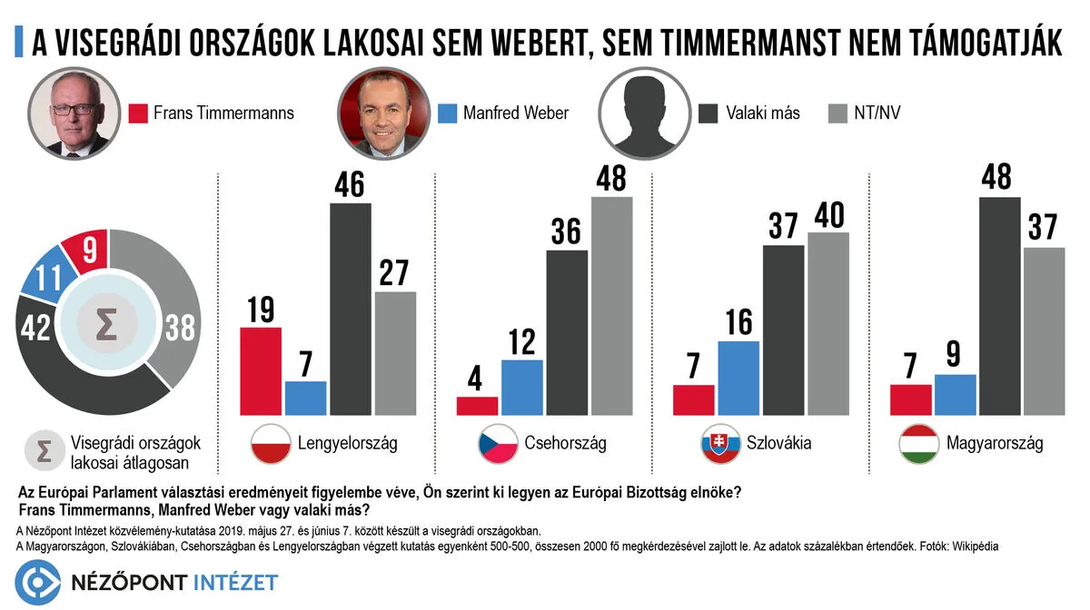 Magyarországon nem volt tízből átlagosan egy ember sem, aki vagy Timemrmanst (7 százalék), vagy Webert (9 százalék) ültetné elnöki pozícióba. A magyarok fele (48 százalék) valaki mást szeretne bizottsági elnöknek. Lengyelországban hiába kaptak a néppárti és szocialista koalíció pártjai 38,47 százaléknyi szavazatot, a két pártcsalád csúcsjelöltje mindössze 27 százaléknyi ember támogatottságát élvezi. Szlovákiában pedig még a gyengén szereplő SMER-re szavazó 15,72 százaléknak is csupán kevesebb, mint a fele (7 százalék) támogatja a szocialista pártcsalád elnökjelöltjét. A PiS ellenes eljárás miatt a lengyel ellenzékiek körében magának hírnevet szerző Frans Timmermans Lengyelországban a legnépszerűbb (19 százalék). Szlovákiában pedig Manfred Weber (16 százalék), de még ezekben az országokban is legalább kétszer ennyien mást szeretnének bizottsági elnöknek (46 és 37 százalék), mint őket. A V4 kormányfők ezért erős mandátummal mennek Brüsszelbe, s egyikük kezét sem köti választói elvárás a csúcsjelöltek kapcsán.