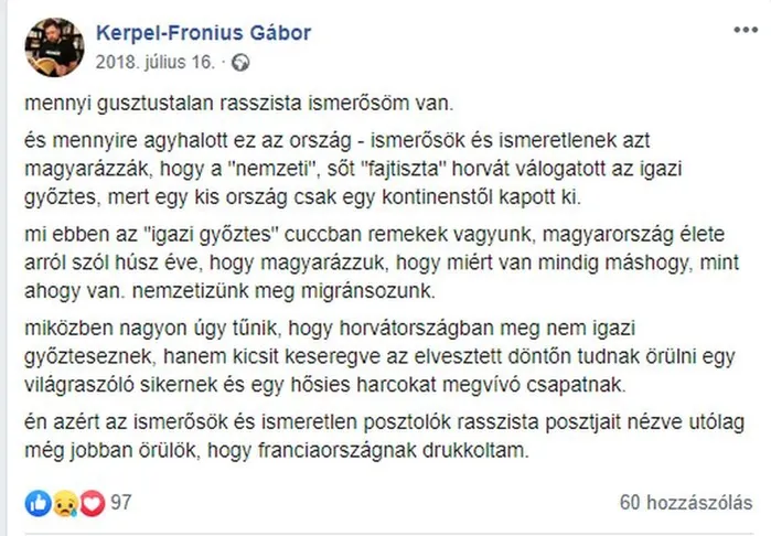 Kerpel hozzáteszi: a rasszista posztokat nézve még jobban örül annak, hogy ő Franciaországnak drukkolt. A Momentum hétfőn jelentette be, hogy Kerpel-Fronius Gábort indítja a főpolgármesteri pozícióért folyó versenyben.