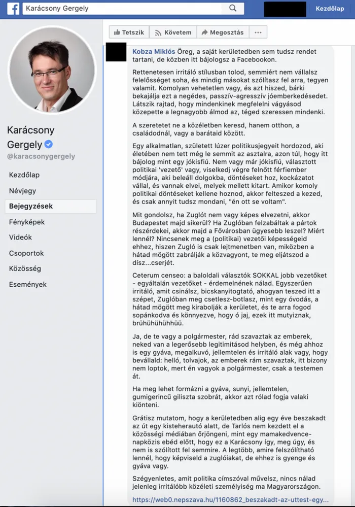 Ezt a mestermunkát egyszerűen nem tudta szó nélkül hagyni Kobza Miklós, kommunikációs szakember, aki hosszas válaszban fejtette ki gondolatait az ominózus Facebook-poszt alatt, mintegy visszaküldve az iskolába a zuglói polgármestert. Az üzenet nagyrészt Karácsony alkalmatlanságáról szól, valamint külön kitér arra, hogy a baloldal főpolgármester-jelöltje sosem vállal felességet, csupán ujjal mutogat mindenkire, és a legolcsóbb politikai haszonszerzést tartja csak szem előtt. Az üzenet slusszpoénja pedig az, hogy Kobza belinkel egy cikket, mely pont Karácsony kerületéből említ példát egy hasonló balesetről, amikor Zuglóban szakadt be egy autó alatt az úttest másfél éve, a lánglelkű Karácsony Gergely regnálása alatt. Érdekes, akkor a most felháborodó baloldali főpolgármester-jelölt lapult a fűben, de ahogy Kobza írja, Tarlós sem sírta tele a hazai médiát a zuglói vátesz alkalmatlanságáról, hiszen az ilyesmi oktalan és igazságtalan sárdobálás. Mert van egy szint, ami alatt csak az ilyen jellemtelen és gyáva emberek képesek hadakozni. Foggal-körömmel a hatalomért. Íme Kobza Miklós válasza Karácsonynak: