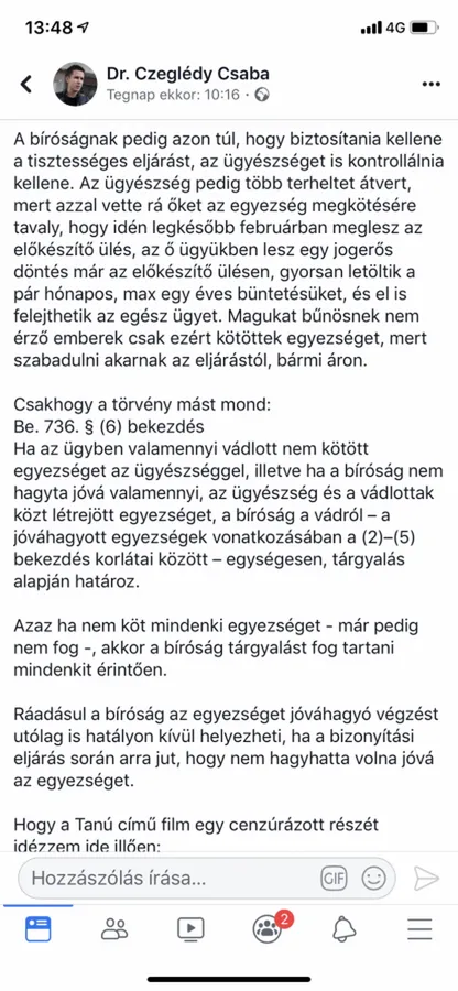 CZEGLÉDY ÁLLÍTJA: AZ ÜGYÉSZSÉG ÁTVERTE AZ EGYEZSÉGET KÖTÖTT VÁDLOTTAKAT