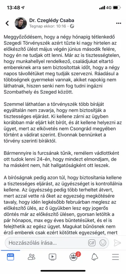 Czeglédy Csaba a Szegedi Törvényszéket illetve a Csongrád Megyei Főügyészséget illető vádjait nem csak a Facebookon tette közzé, hanem az ugytudjuk.hu szombathelyi portálnak adott interjúban is elmondta. A Facebook posztot csaknem kétszázan osztották meg egy nap alatt.