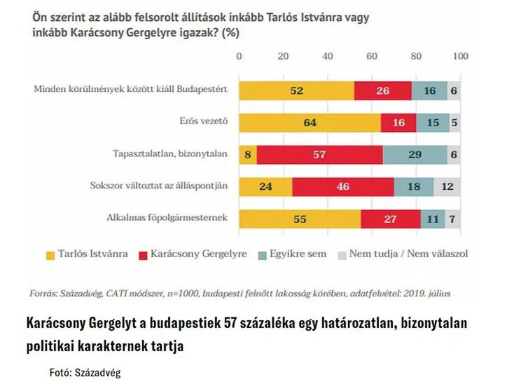 Jogosan merül fel, hogy mely tényezőknek köszönhető a főpolgármester magas népszerűsége és kihívójának elutasítottsága? -teszik fel a kérdést. A Századvég júliusi közvélemény-kutatása szerint a fővárosiak 52 százaléka úgy véli, hogy Tarlós István képes Budapestnek kiharcolni mindazt, amire a városnak szüksége van, 64 százaléka pedig erőskezű vezetőnek látja, szemben balliberális kihívójával, akiről pusztán a megkérdezettek 16 százaléka vélekedik így. Ezzel összefüggésben Tarlóst több mint kétszer annyian tartják alkalmasnak a főpolgármesteri teendők ellátására (a válaszadók 55 százaléka), mint Karácsony 2. oldal Gergelyt (27 százalék). Ez utóbbi körülmény elválaszthatatlan attól a ténytől, hogy Tarlós István képes volt felszámolni a Demszky-korszak rendezetlen viszonyait, pénzügyi stabilitást teremtett a városházán, és jelentős lépéseket tett a – baloldal által elhanyagolt – városkép megújítása érdekében is, míg az MSZP-Párbeszéd jelöltje gyakorlatilag csődközeli helyzetbe kormányozta Zuglót, miközben saját politikai karrierjének építésén fáradozott. Ezen felül Karácsony Gergelyt a budapestiek 57 százaléka egy határozatlan, bizonytalan politikai karakternek tartja, továbbá a többség azt sem feltételezi, hogy Karácsony hajlandó lenne teljes mellszélességgel kiállni a főváros mellett (mindössze a megkérdezettek 26 százaléka van eltérő állásponton).