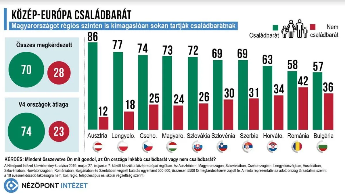 A visegrádi és a közép-európai országok előtt is van azonban még tér a fejlődésre, ugyanis Ausztriában ugyanerre a kérdésre 86 százaléknyian feleltek úgy, hogy országukat családbarátnak gondolják és mindössze minden tizedik (12 százalék) osztrák mondta azt, hogy ez nincs így.