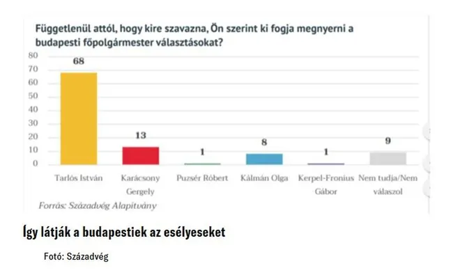 A felmérés szerint a budapestiek 68 százaléka úgy véli, Tarlós István fog győzni októberben a főpolgármester-választáson. A Századvég elemzői szerint látható, hogy még az ellenzéki szavazók tekintélyes része is a jelenleg regnáló főpolgármester újraválasztására számít, ami jelentős mértékben csökkentheti ennek a tábornak a részvételi hajlandóságát az őszi voksoláson.