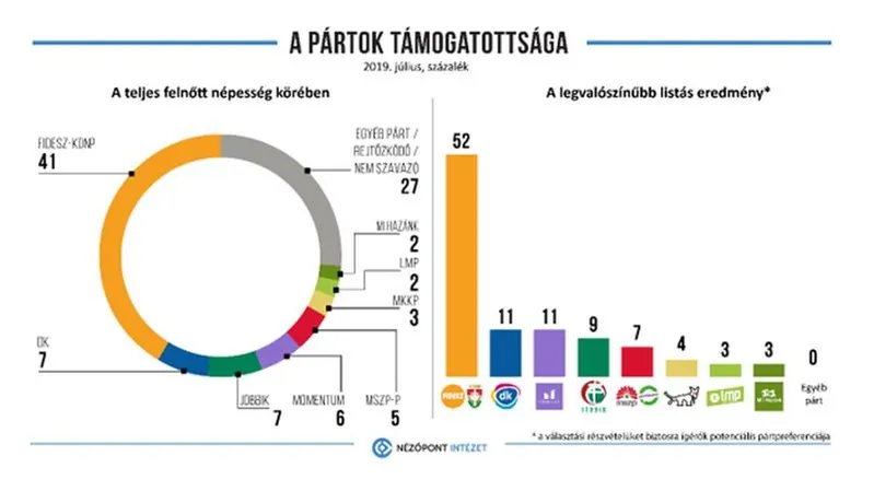 A legvalószínűbb listás eredményeket tekintve a Fidesz-KDNP előnye 40 százalékpontos, egy most vasárnap esedékes választáson 52 százalékot szereznének a kormánypártok belföldi listán, ami szinte teljesen megegyezik az EP-választáson elért eredményükkel. A legaktívabb táborral az ellenzéki térfélen a Demokratikus Koalíció és a Momentum Mozgalom bír: ők egyaránt 11-11 százalékpontos eredményt érnének el listán. Vagyis Gyurcsány Ferenc pártja nem tudta leszakítani magáról a Momentumot. A belpolitikai botrányoktól júliusban sem mentes MSZP-P szövetség a biztos szavazók esetében 7 százalékon áll, vagyis Tóth Bertalanék vesszőfutása továbbra is folytatódik. A Jobbik támogatottsága továbbra is egyszámjegyű: 9 százalékpontos eredményt érnének el egy most vasárnap esedékes voksoláson listán, ami jól mutatja, hogy szavazótáboruk továbbra sem aktív. A mandátumszerzési küszöböt jelentő, biztos szavazók körében mért 5 százalékpontos támogatottságot a női társelnök nélkül maradt LMP (3 százalék), a Mi Hazánk Mozgalom (3 százalék) és a Magyar Kétfarkú Kutyapárt (4 százalék) sem éri el.