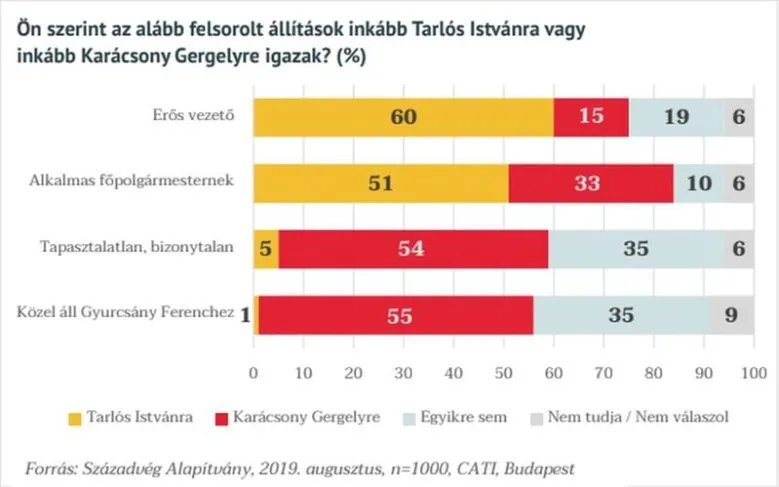 A zuglói polgármestert ezzel szemben csupán a megkérdezettek 15 százaléka tartja erős vezetőnek, és többségük alkalmatlannak tartja a főpolgármesterségre (33 százalékuk vélekedik ettől eltérően). Ezen felül Karácsony Gergelyt a válaszadók 54 százaléka tapasztalatlan és bizonytalan politikusnak tartja, míg Tarlós István esetében ez az arány mindössze 5 százalék. A budapestiek véleménye feltehetőleg Karácsony Gergely sikertelen zuglói polgármesteri tevékenységével áll összefüggésben. Ezen felül a megkérdezettek 55 százaléka szerint Karácsony közel áll Gyurcsány Ferenchez, míg a jelenlegi főpolgármesterről csupán 1 százalékuk feltételezi ezt. A válaszadók döntő többsége tehát tisztán látja, hogy az ellenzéki oldalon a volt miniszterelnök diktál, amitől a zuglói polgármester sem tudja függetleníteni magát.