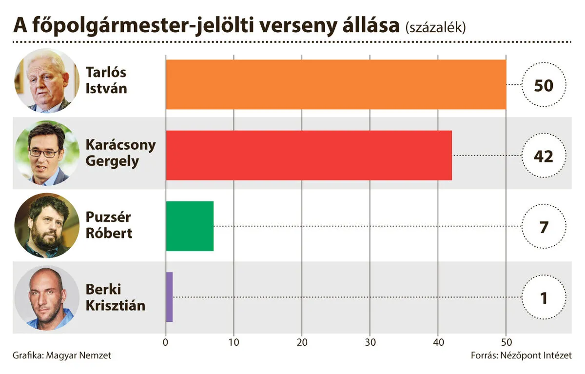 Egy hónappal az önkormányzati választások előtt változatlanul őrzi vezető helyét a főpolgármesteri címért folytatott küzdelemben Tarlós István, aki egyedül is begyűjtené a szavazatok felét (50 százalék) – derül ki a Nézőpont Intézetnek a Magyar Nemzet számára készült legfrissebb budapesti közvélemény-kutatásából. A városvezető a jelenlegi állás szerint jobb eredményt is elérhet, mint 2014-ben, amikor 49 százalékot szerzett.