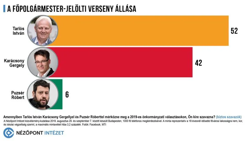 Mivel sokkal alkalmasabbnak tartják a választók a főpolgármesterségre, nem meglepő, hogy a főpolgármester-jelöltek versenyében is jelentős Tarlós István előnye. A biztos szavazók körében 52 százalékos a támogatottsága, míg Karácsony Gergely 42, Puzsér Róbert pedig hat százalékot szerezne. Mindez minimális emelkedés Tarlós István esetében és hasonló csökkenés Karácsony Gergely támogatottságában.