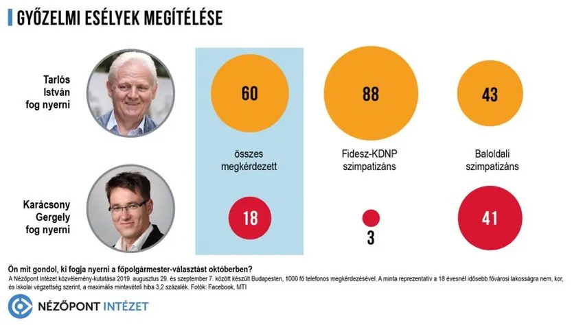 Igazán beszédes adat azonban az, hogy a baloldali ellenzéki szimpatizánsok is inkább Tarlós győzelmére számítanak. 43 százalékuk szerint nem lesz változás a főpolgármester személyében, s csak 41 százalékuk gondolja, hogy Karácsony Gergely Demszky Gábor késői utódjává válhat.