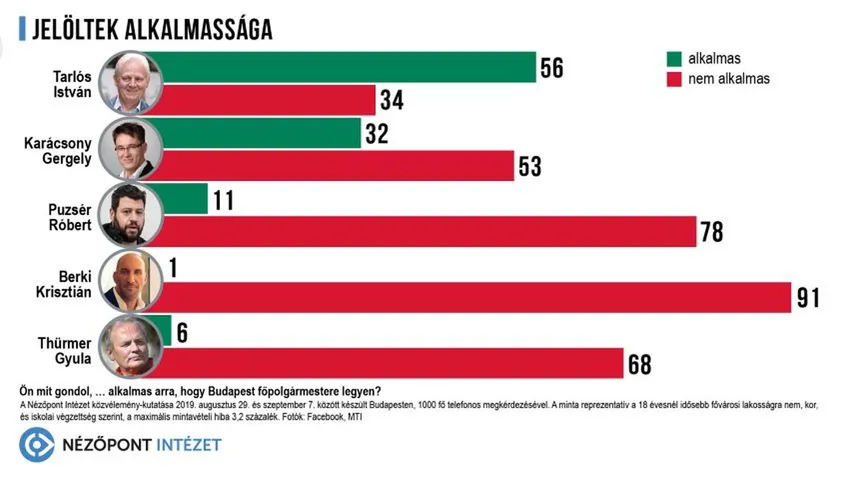 A Zuglóban újabb megmérettetést nem vállaló Karácsony Gergelyt a budapestiek 32 százaléka tartja a főpolgármesterségre alkalmasnak, 53 százalékuk, azaz a budapestiek abszolút többsége viszont egyértelműen kételkedik ebben. Az ellenzéki pártok jelöltjén túl, Tarlós István kihívójaként régóta versenybe szállt Puzsér Róbertet csak a szavazók 11, a nemzeti baloldali Thürmer Gyulát hat, míg a rivaldafényt kereső Berki Krisztiánt egy százalékuk nevezte alkalmas jelöltnek.